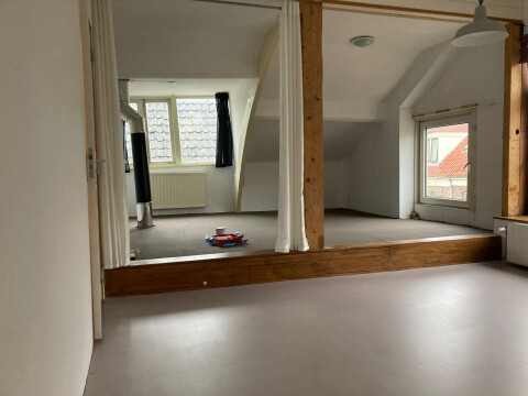 Grote kamer (35m2) voor 2 jaar te huur. Bovenverdieping gedeeld met 1 andere persoon (keuken/douche/toilet). Eigen opgang, ruimte voor fiets binnen hek. Kamer is boven familiehuis dus gevraagd wordt een rustig persoon.